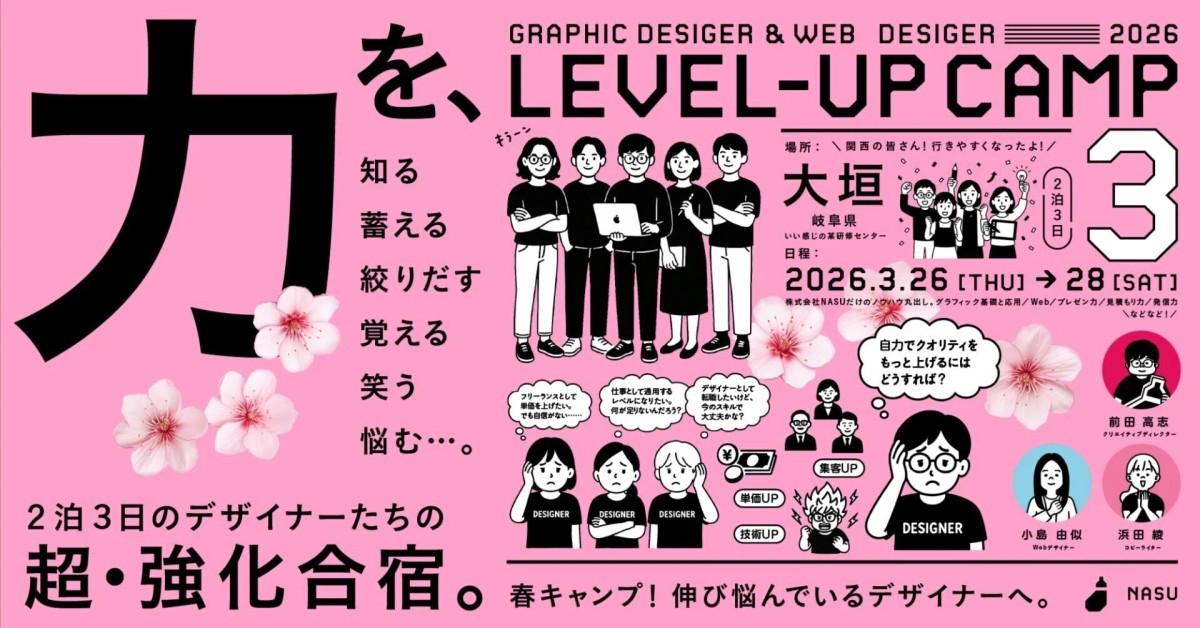 グラフィックデザインの「基本」「応用」「Web」「プレゼン」「値付け」「情報発信」など、「デザイナーの実力」と「単価アップ」に絞ったカリキュラムです。このキャンプでは、AIの時代だからこそ本質的な力を身につけることを目的としています。これまで2回開催し、約40名が参加。かなり好評の声を聞いております。